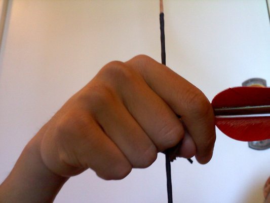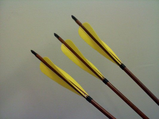 For fletching, I recommend feathers. Traditional Chinese arrows used long, low-profile fletching (no taller than the thickness of the shaft). Since I do not use custom fletch cutters, I typically order 4" or 5" parabolic feathers. If the front tip of the fletching feels hard and plastic-like (due to a flaw in the manufacturing process), you may want to use a file to rub it down or cover it with a dab of a thick viscous glue such as Duco Cement (so it is less likely to slice your hand during a shot). I have not shot arrows with plastic vanes, as I am uncertain whether the semi-rigid plastic would injure the hand.